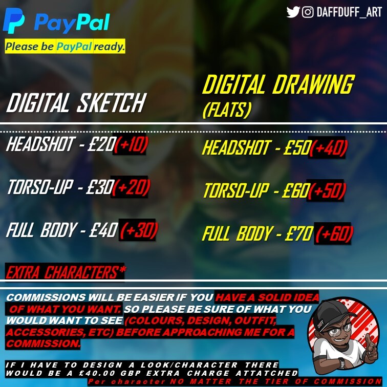 Please be sure you can pay for your commission via PayPal and PayPal only in £ GBP Great British pounds.